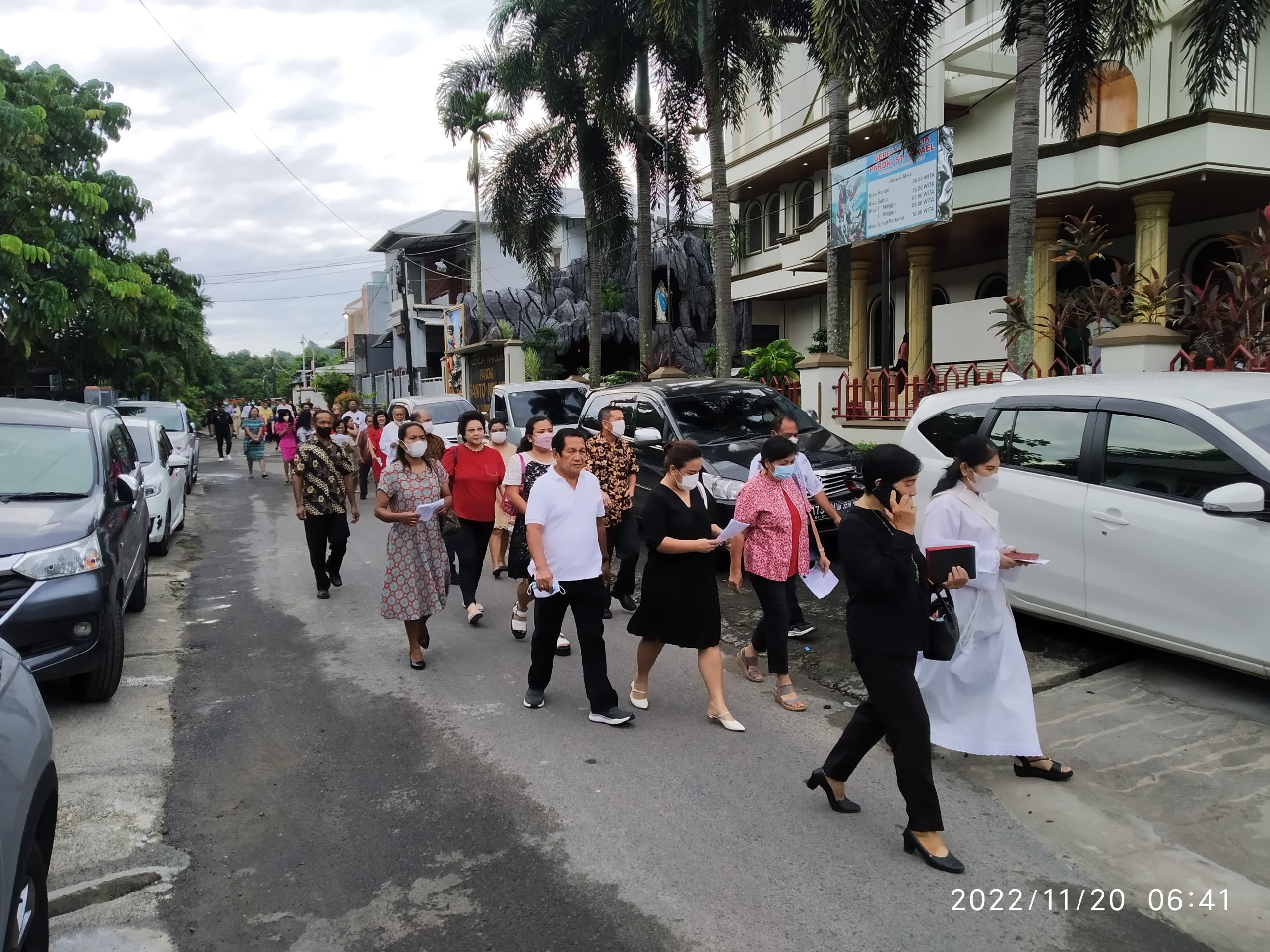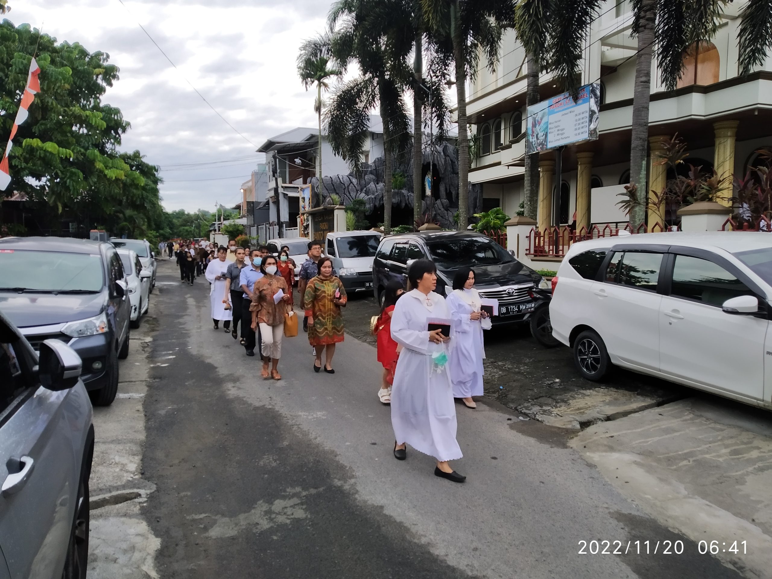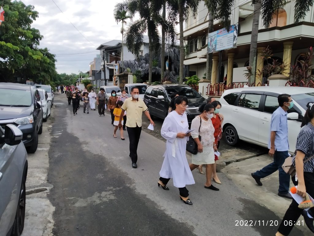 Pastor Paroki St Mikael, RD Wens Maweikere memimpin perarakan memutari lorong sekitar kompleks Gereja St Mikael, dimulai dari Basemen Aula St Mikael, pada jam 06.30 Wita.