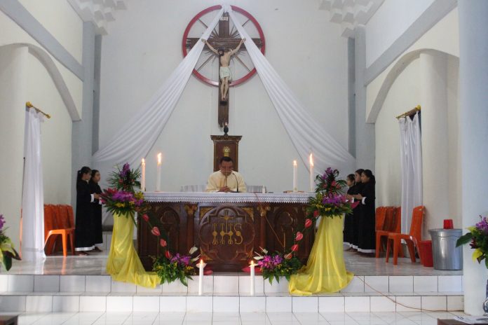 Perayaan ekaristi dimulai pukul. 17.00 wita yang dipimpin oleh Pastor Paroki, Pastor Aloisius M. Pondaag, Pr. Dalam Ekaristi Kudus ini, turut hadir juga dari Komunitas Suster Jesus Maria Josep Tompaso Baru, Komunitas Bruder BTD Ranoyapo, dan tentunya seluruh umat Stasi Hati Kudus Raraatean. Dalam Khotbahnya, Pastor Sius menyampaikan bahwa peristiwa hari ini adalah peristiwa iman untuk menghayati semangat Yesus dalam kehidupan setiap hari. “Kasih dan Cinta Kristus kepada kita tidak bisa diukur dengan kalkulasi manusia, sekalipun kita sering mengingkariNya”, lanjut Pastor Sius.