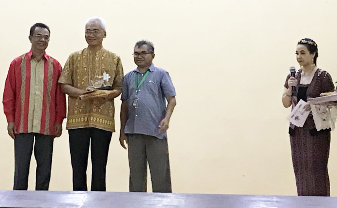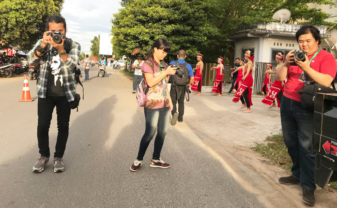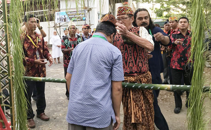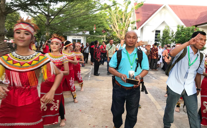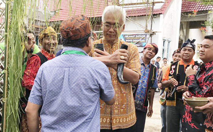 34 peserta yang dipimpin presiden Signis, Rm. Frans de Sales, SCJ disambut dengan ritual pemasangan kopiah coklat kepada presiden Signis, pemotongan bambu penghalang dan meminum tuak.