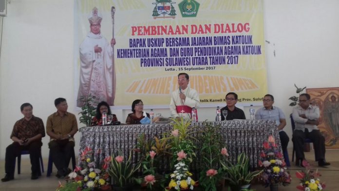 Jumat, 15 September 2017, Bertempat di Lotta-Pineleng Bimas Katolik Kementerian Agama Prov. Sulut mengadakan pembinaan dan dialog dengan bapak Uskup Keuskupan Manado bersama jajaran Bimas Katolik Kementerian Agama dan para guru Pendidikan Agama Katolik Prov. Sulut tahun 2017. Kegiatan ini diawali dengan Perayaan Ekaristi yang dipimpin Mgr. Benedictus Rolly Untu, MSC.