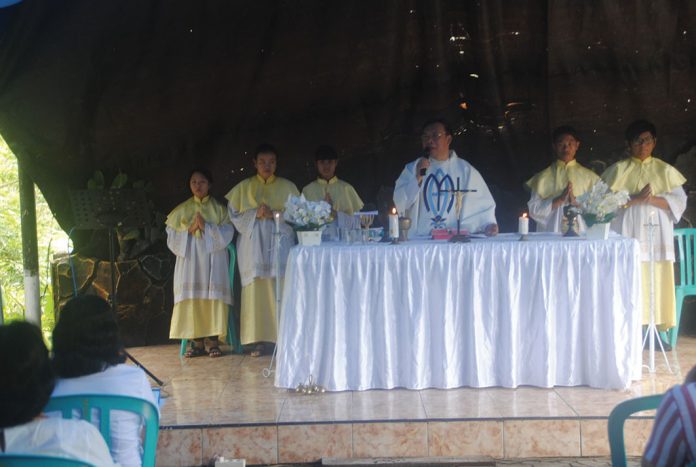 Pukul 8.15 pagi, Doa Rosario Misteri pertama dimulai dari halaman Pastoran Donggala. Misteri kedua, dan ketiga didoakan sambil berjalan menuju puncak bukit. Misteri keempat dan kelima di depan pintu Gua Maria. Selesai lima misteri yang seluruhnya dipandu oleh KBK dilanjutkan dengan Perayaan Ekaristi dengan Selebran Pst. Jimmy Tore Pr. Pastor Paroki Pst. Laurentius Karamoy tidak ikut dalam ziarah ini, karena diundang untuk menghadiri Misa Pertama Pst.  Nicholas John Bomba Pr di Bada-Poso.